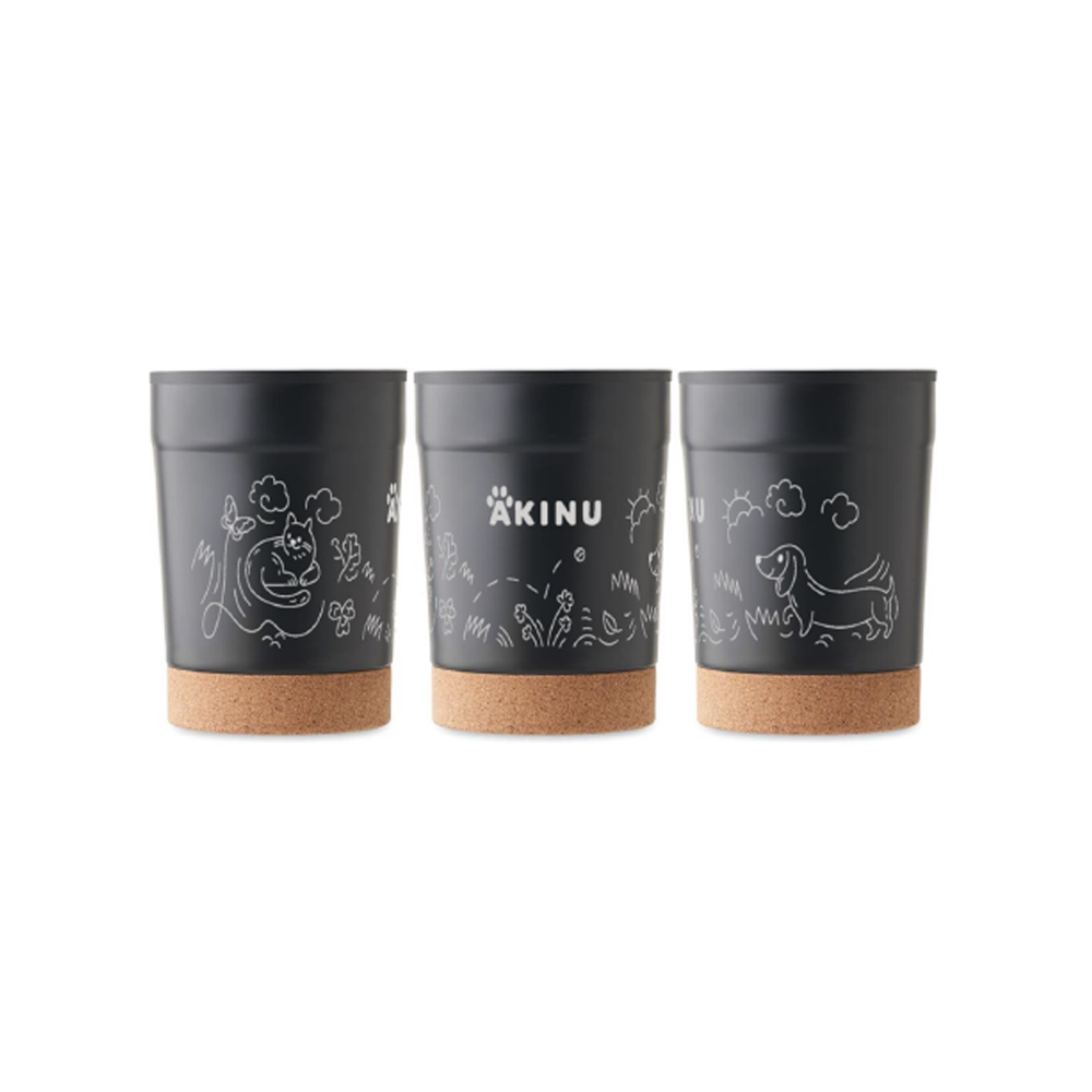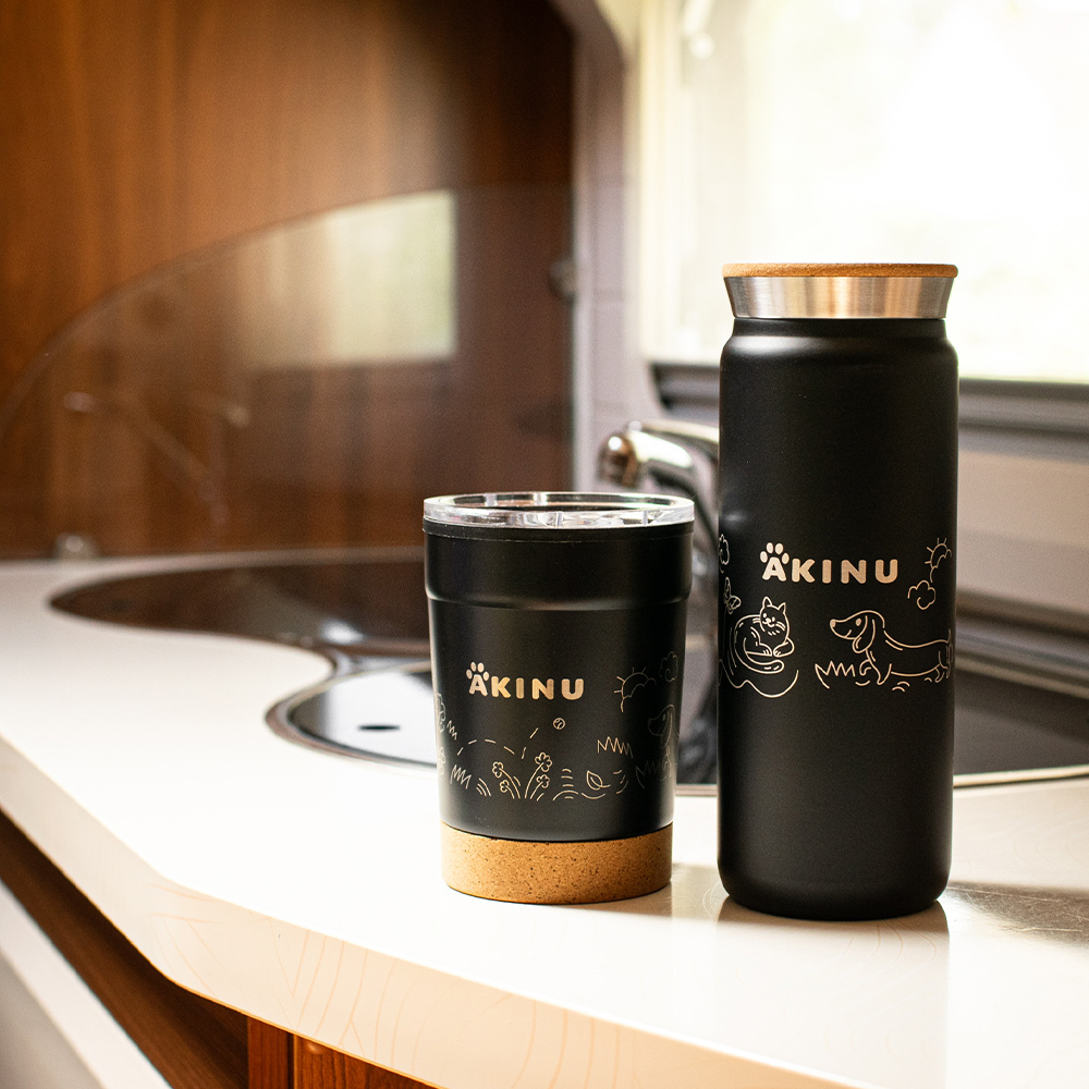 Černý termohrnek z nerezové oceli zdobí jemné gravírované kresby Akinu, které odkazují na lásku ke zvířatům. Spodní část hrnku tvoří korkové dno pro větší stabilitu a přírodní vzhled. Průhledné plastové víčko s těsnící gumou zabrání nechtěnému vylití nápoje. Díky kvalitnímu materiálu udrží váš nápoj teplý nebo studený po delší dobu.