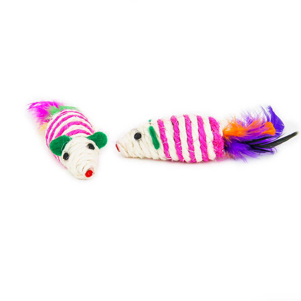 Sisal je přírodní materiál, o který si kočka účinně obrušuje své drápky. Pro větší atraktivitu Sisalové myšky chrastí a na místo ocásku mají barevná pírka. Myšky přirozeně působí na lovecký instinkt koček, které zkrátka milují jejich lovení po vašem bytě. S touto hračkou se vaše kočička nebude nikdy nudit.