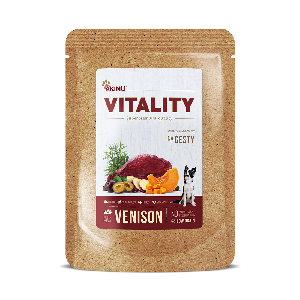 Akinu VITALITY na cesty spojuje prvotřídní maso, zeleninu, ovoce a bylinky v praktickém balení, které vašemu psovi nabízí nejen výbornou chuť, ale i nutričně vyváženou stravu na cestách.