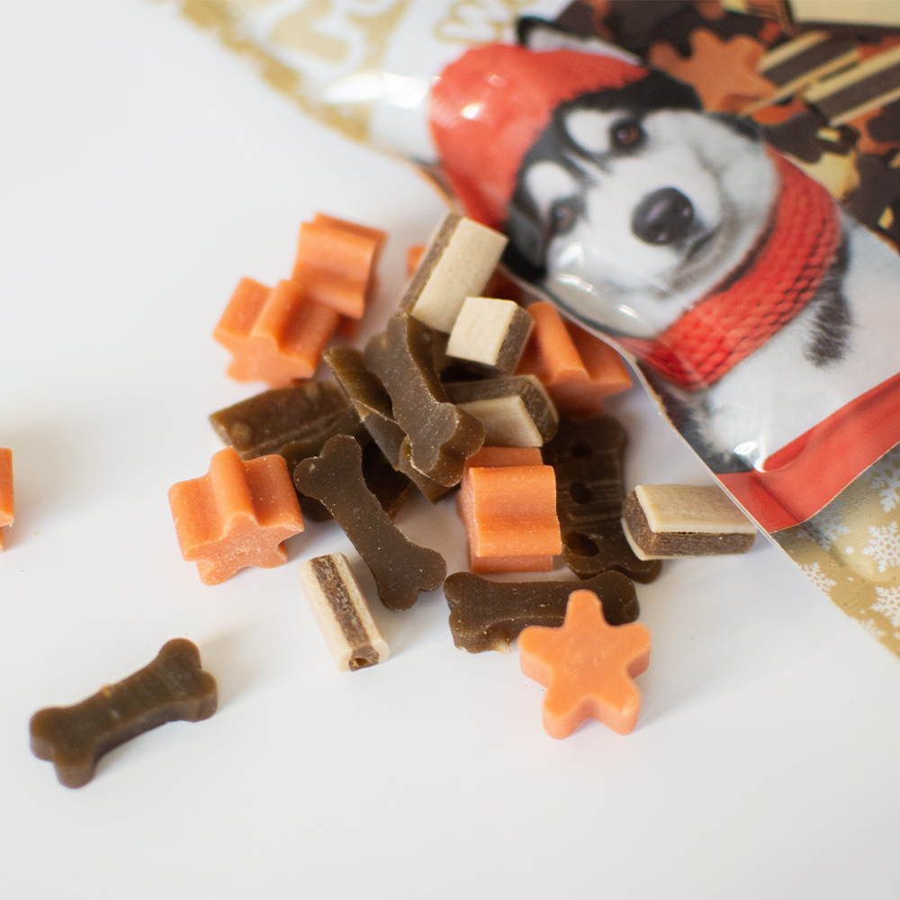 Praktické balení obsahuje masové pamlsky ve třech tvarech: kostičky, hvězdičky a pásky. Díky rozmanitým tvarům a chutím budou odměny pro pejska vždy zajímavé a nikdy neomrzí. Ideální jako sváteční mlsání nebo voňavá odměna při společných chvílích během zimy.