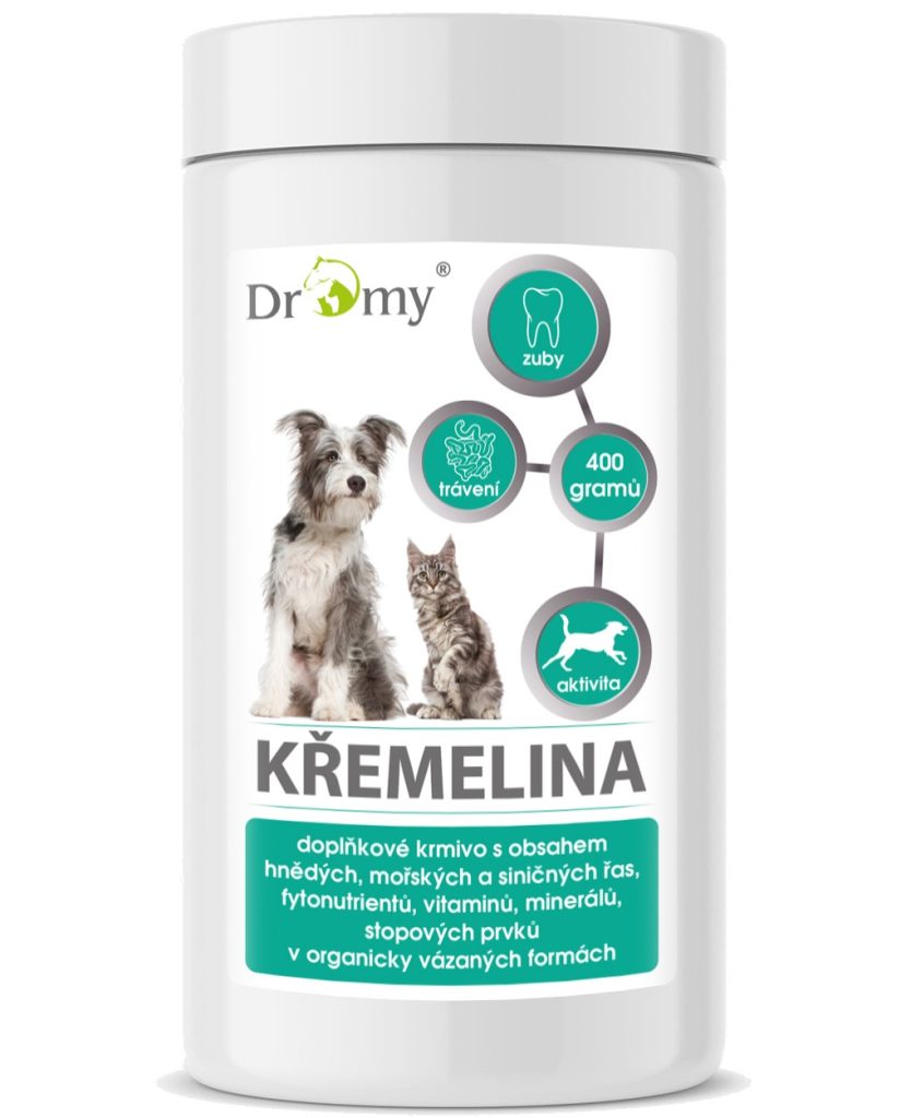 Křemelina je doplňkové krmivo pro psy a kočky, s obsahem mikroskopických schránek jednobuněčných řas druhu Aulacoseira, sladkovodních a mořských řas, rostlinných extraktů, vitaminů a stopových prvků.