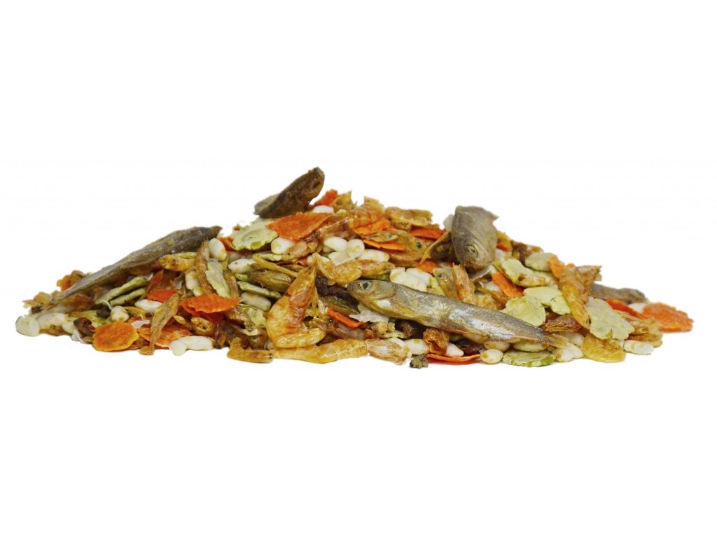 hnědá rýže vločky natural, pufovaná rýže, pufovaný ječmen, krevety, ančovičky, sardinky, mrkev, hrachové vločky, rajče