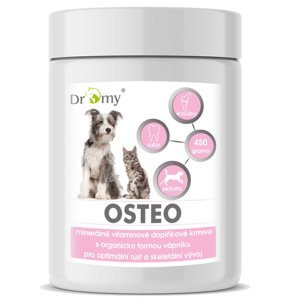 Dromy Osteo pro podporu kostí, zubů, vazů, šlach a svalů psů. Obsahuje dvě formy organicky vázaného vápníku a dalších minerálů a vitaminů, pro intenzivní růst kostí a kloubů štěňat, podporu psů ve zvýšené zátěži a fenek v průběhu laktačního období.