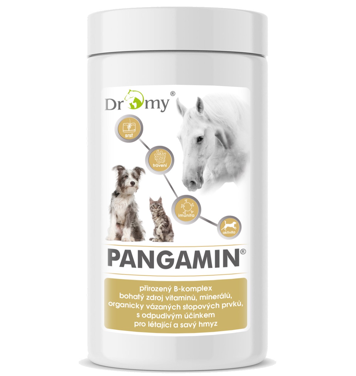 Pangamin® jsou sprejově sušené pivovarské kvasnice Saccharomyces cerevisiae. Je vynikajícím přírodním zdrojem bílkovin a obsahuje přirozený komplex vitaminů skupiny B, (vč. B6 a B12). Pangamin® je zdravý pamlsek, který napomáhá upravovat metabolismus, zvyšuje využitelnost vitaminů,minerálů a stopových prvků z krmné dávky. Pangamin® je podpůrný prostředek pro mladé psy v růstu a dospívání, krmný doplněk obsahující látky a vitaminy nepostradatelné k regeneraci organismu.