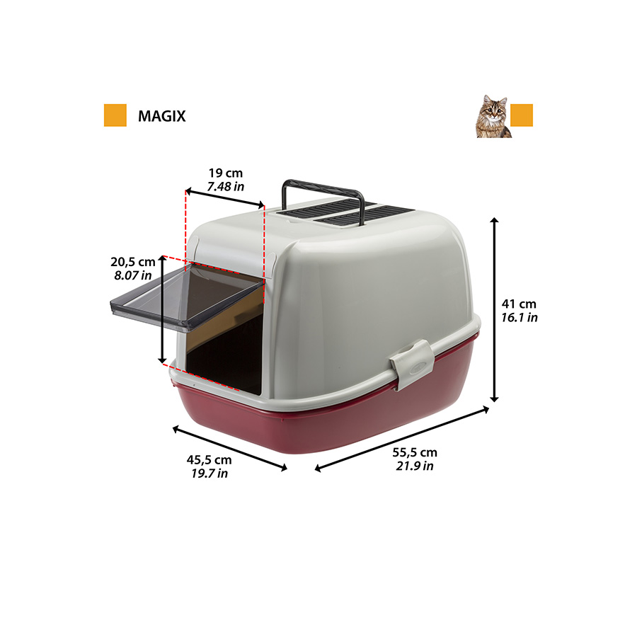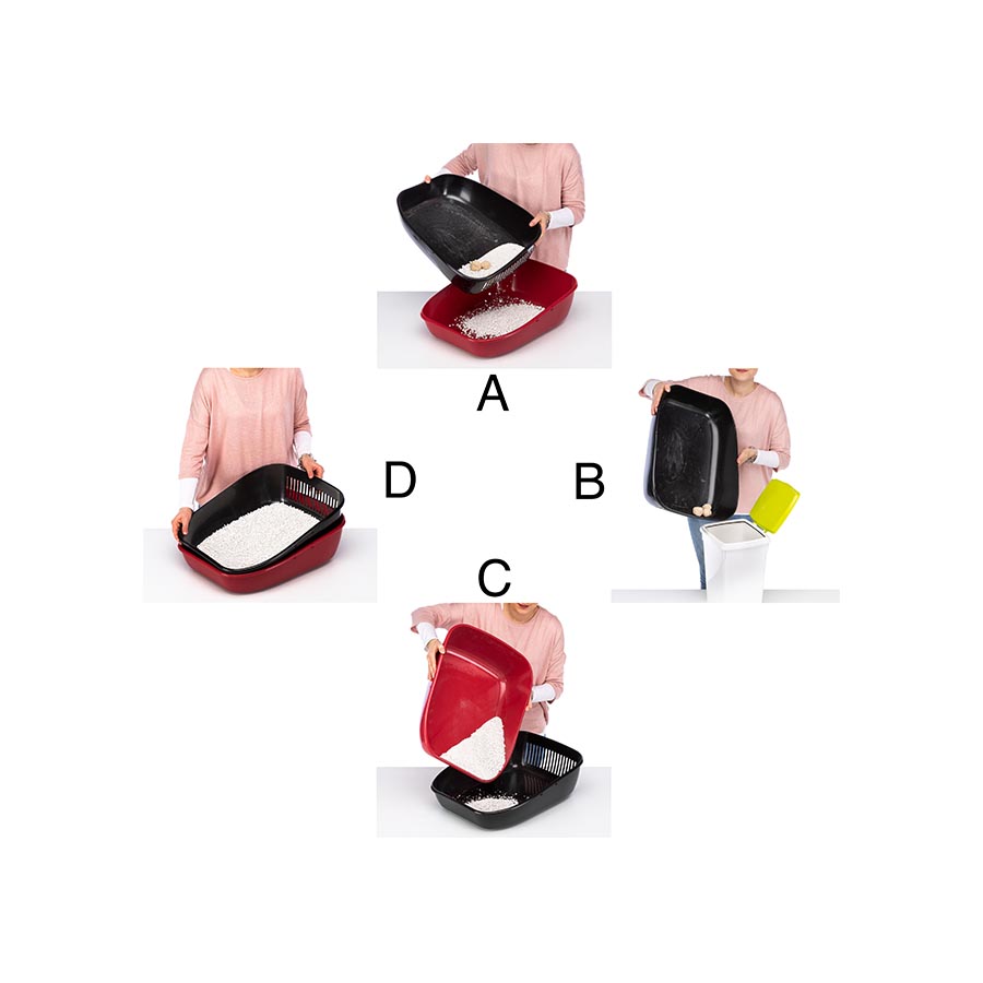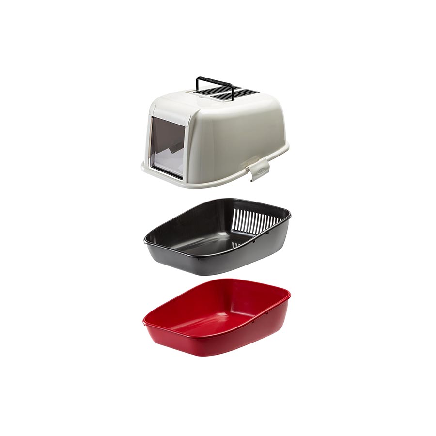 Kočičí toaleta vyrobená z pevného plastu. Skládá se z jedné standardní základny, jedné základny se sítkem a jednoho krytu. Podnos vybavený sítovou sadou pro odstranění špinavé podestýlky a uložení čisté podestýlky.
