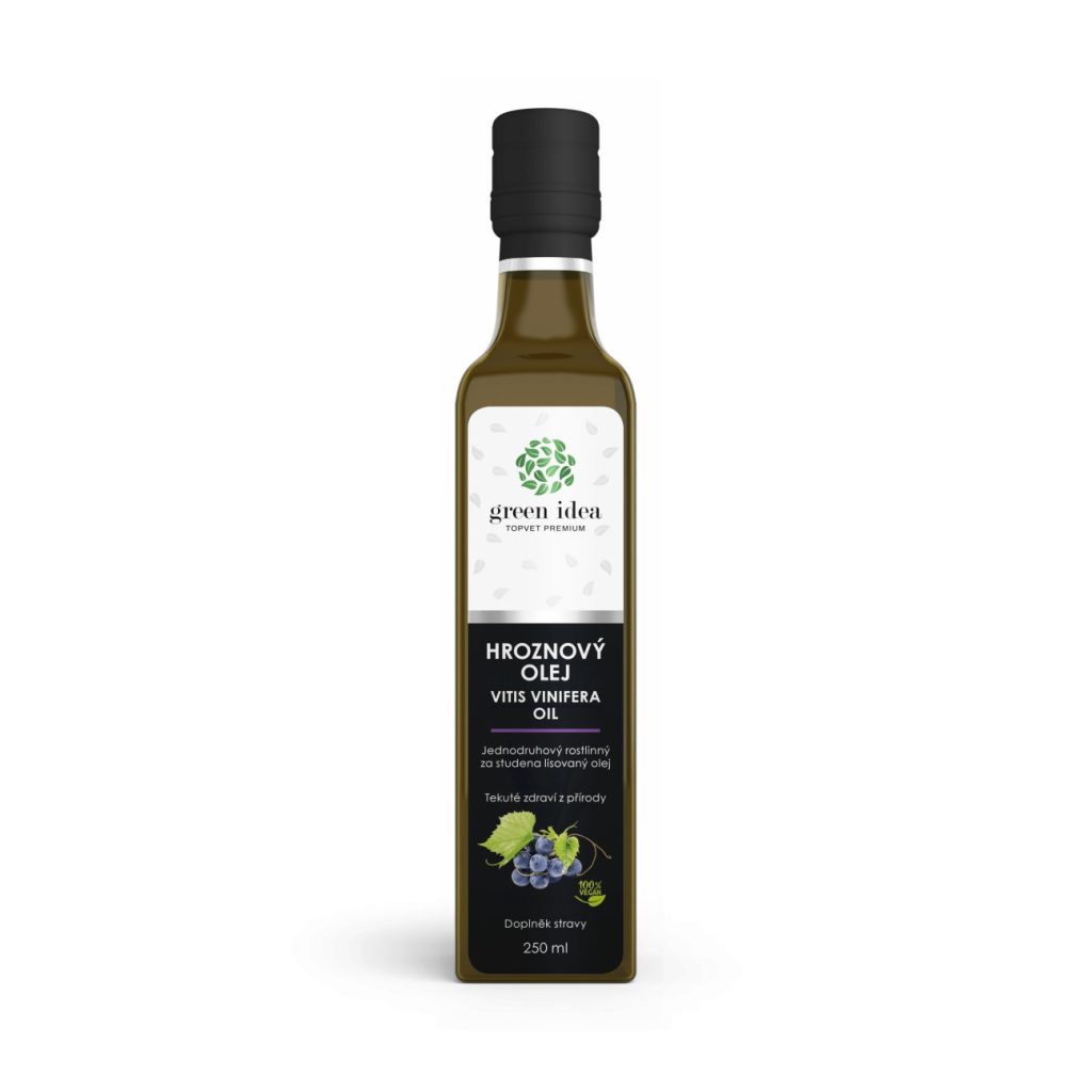 Olej z hroznových jader je bohatý na celou řadu biologicky aktivních látek (zejména oligomerních proantocyanidinů – OPCs). Obsahuje vysoký podíl nenasycených mastných kyselin, které jsou velice důležité pro lidský organizmus. Olej má velmi příjemnou, mírně nasládlou chuť a neutrální mírně oříškové aroma. Přestože Hroznový olej snáší poměrně vysokou teplotu (až 252°C), doporučujeme jej k použití ve studené kuchyni. Olej podporuje normální činnost kardiovaskulárního systému. Vhodný na těžké nohy a úpravu krevního tlaku. Pro normální stav pokožky.