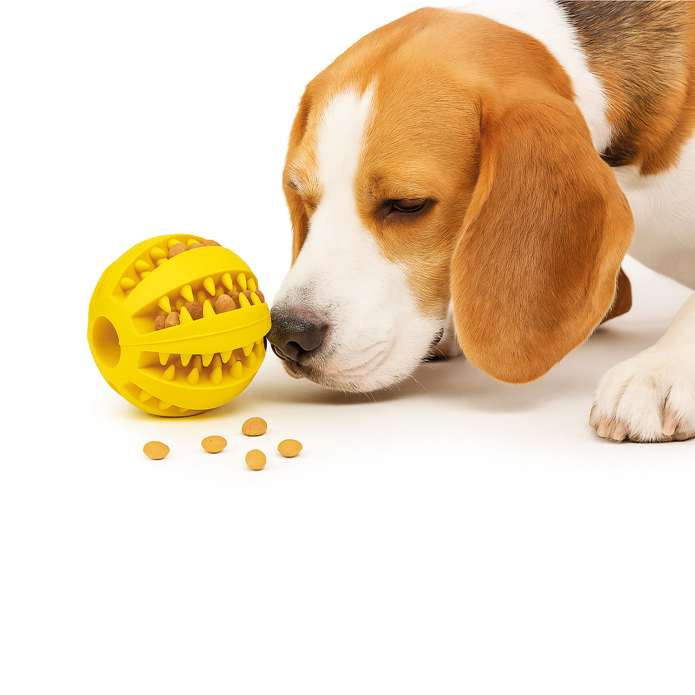 Žvýkání je pro psy přirozený způsob, jak se uklidnit, uvolnit napětí a udržet zuby čisté bez nutnosti kartáčku. Hračky jako tento míček tak spojují radost ze hry s přirozenou péčí o zdravý chrup.