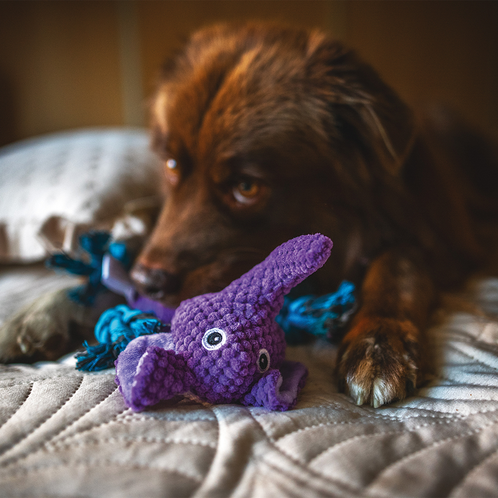 Hračka má v těle pískátko, které podpoří zájem o hru. Místo běžných nožek jsou použity pevné provazy s uzlem, ideální na přetahování nebo žvýkání. Skvělá kombinace různých textur udrží psa v pohybu i mentálně zabaví.