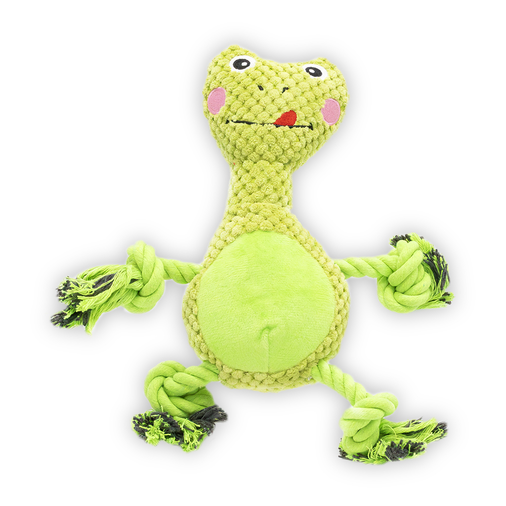 HUGS by Akinu žába – měkká hračka s pískátkem a uzly pro aktivní psy.