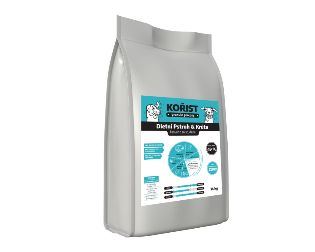 Kořist Dietní Pstruh a Krůta – lisované granule 22/09 Hmotnost: 14 kg