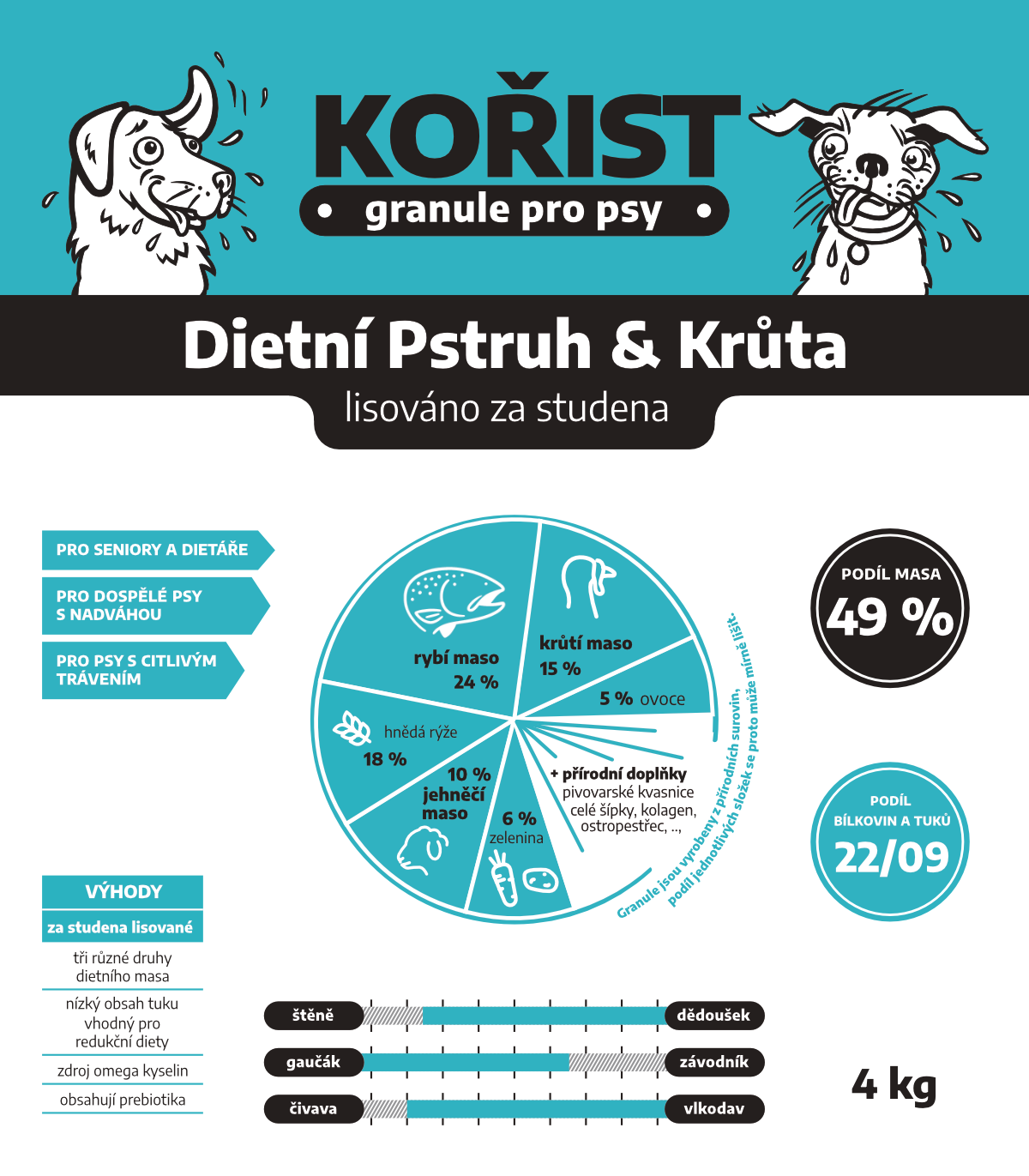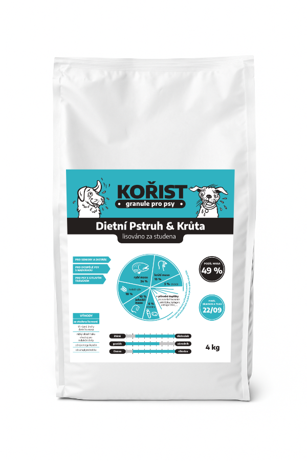 Granule Kořist Dietní Pstruh & Krůta – každá složka v receptuře má svůj smysl – podporuje trávení, klouby, srst, imunitu i celkovou pohodu. Díky šetrnému lisování za studena si zachovávají maximum živin a přirozenou chuť, kterou psi milují: