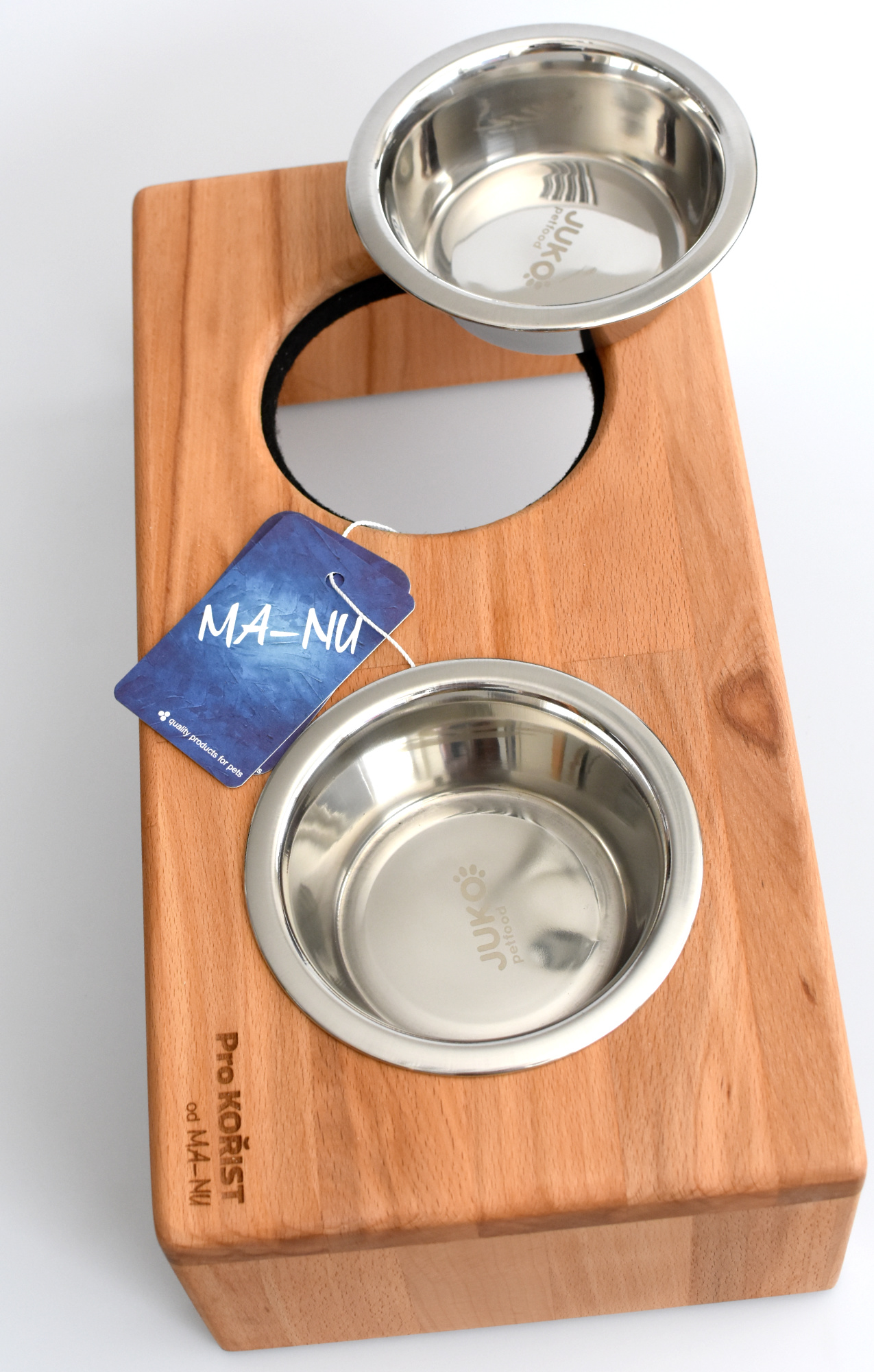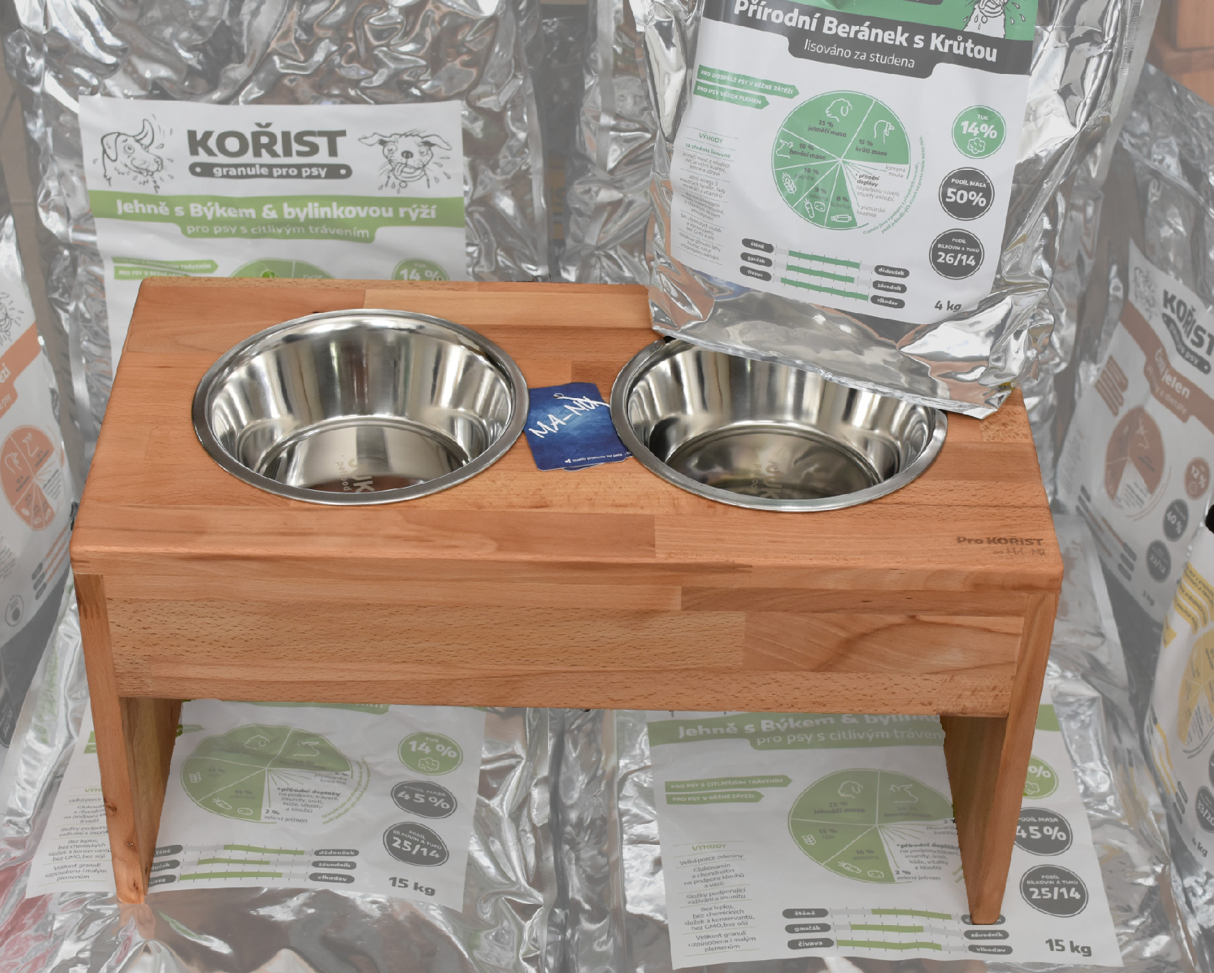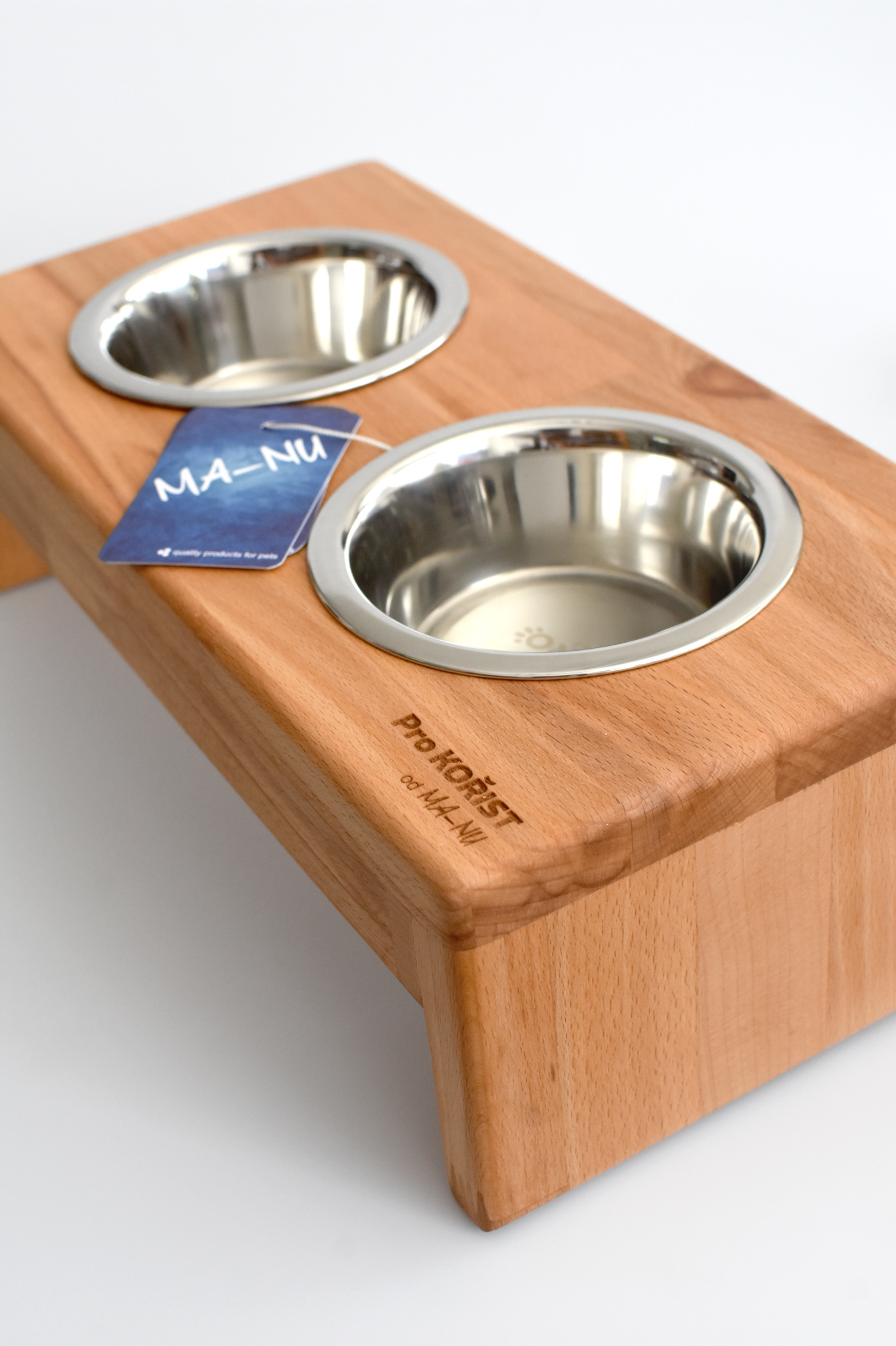 Vítejte ve světě prémiové péče o vaše čtyřnohé miláčky. Vyvýšené stojany na psí misky, známé také jako DogBary, vyrábíme ručně z kvalitního bukového dřeva, které se vyznačuje odolností a krásnou texturou. Každý DogBar natíráme kvalitním olejem s atestem nezávadnosti, čímž zajišťujeme elegantní vzhled, dlouhou životnost dřeva a bezpečnost. ČESKÁ RUČNÍ VÝROBA – pro značku Kořist vyrobeno v ma-nu.cz.