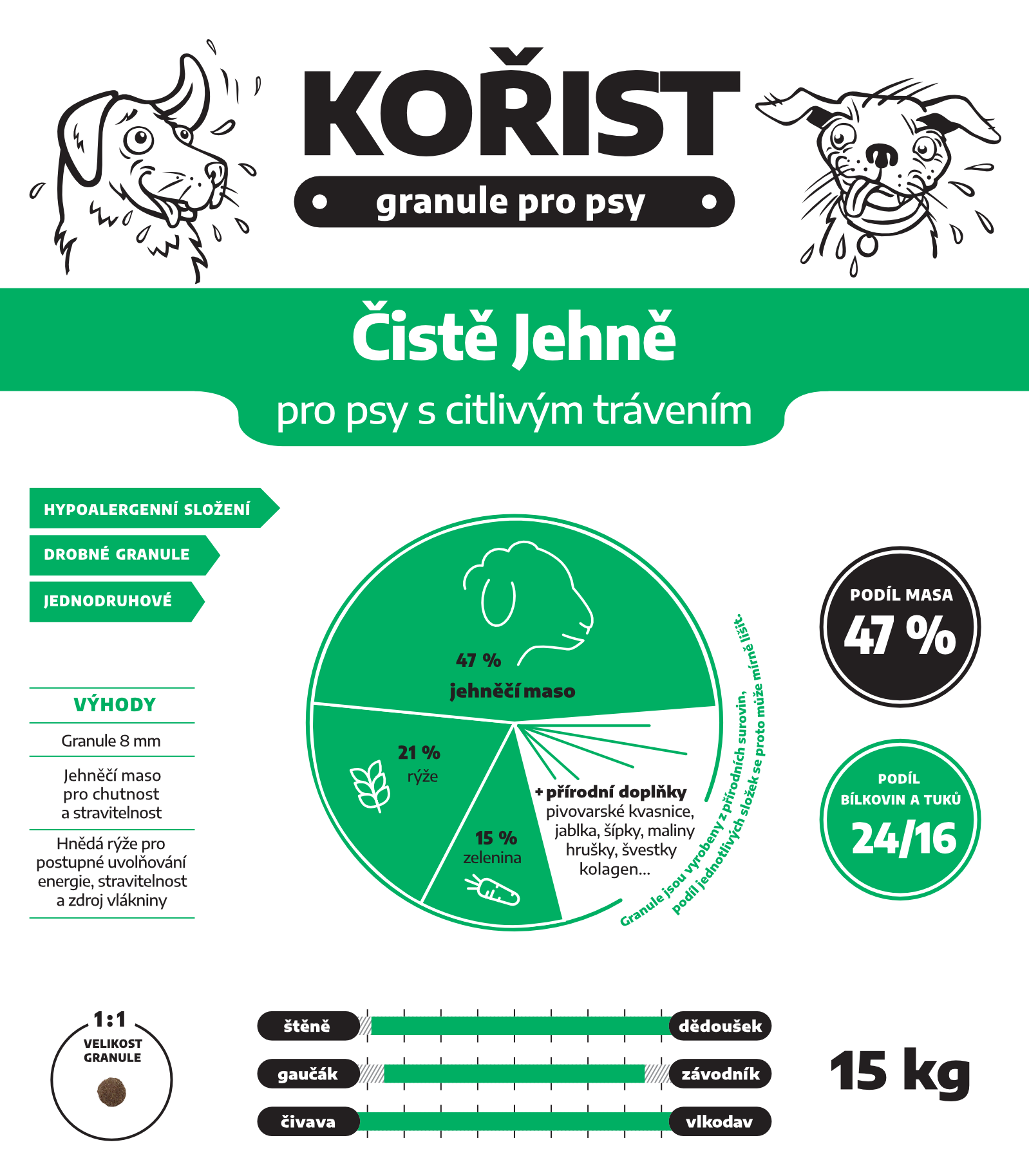 - Pro malé i střední psy – granule mají drobný průměr 8 mm