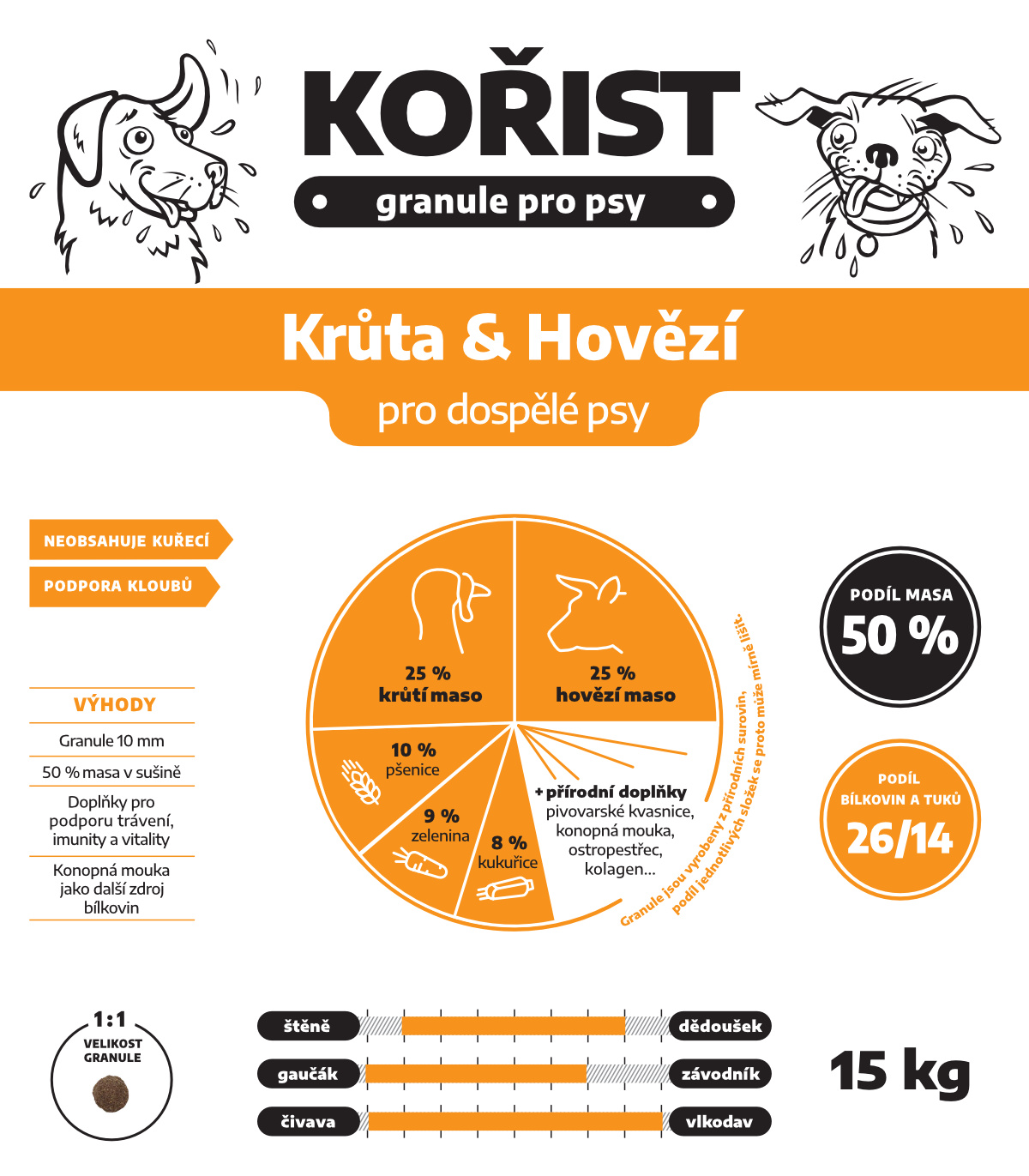 Co v misce zavoní, to v těle pomůže. Granule Kořist – Krůta & Hovězí kombinují kvalitní maso, zeleninu a bylinky pro každodenní výživu, která respektuje přirozené potřeby psa – masožravce.