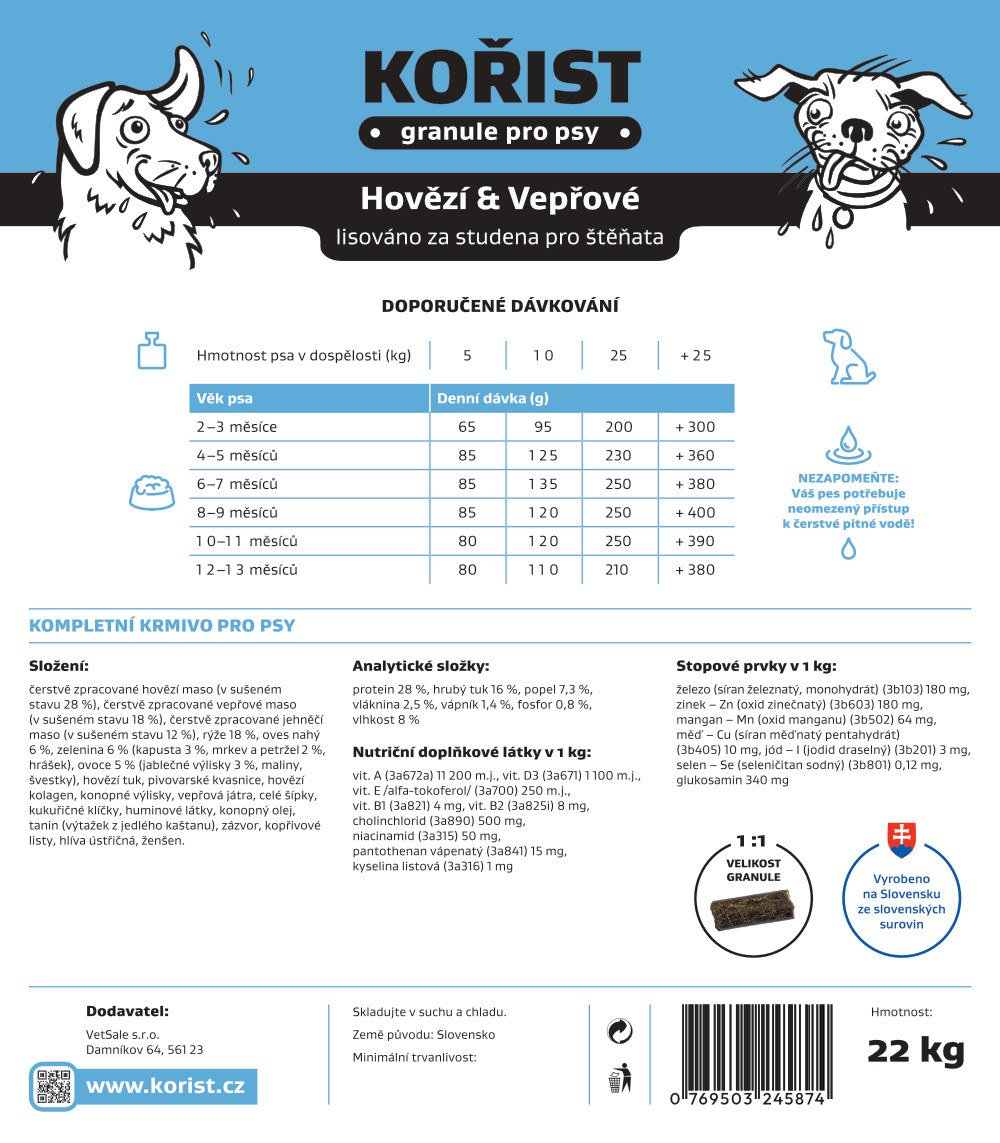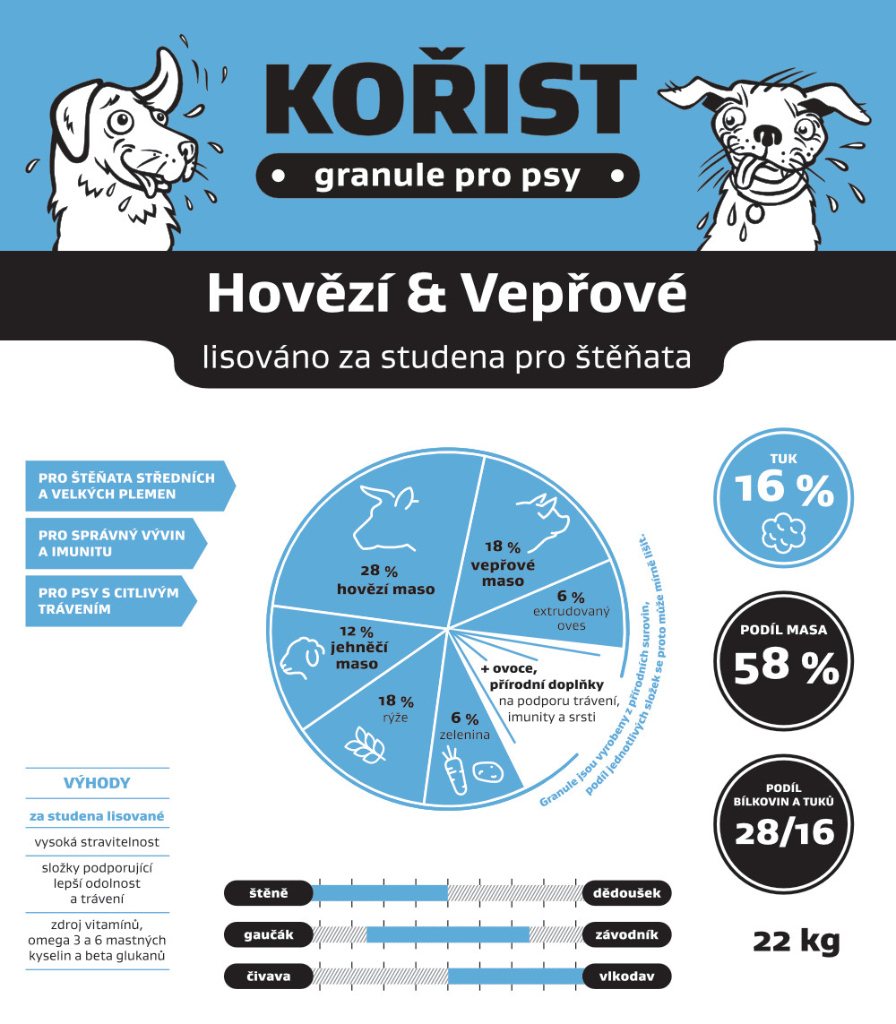 Kořist lisované granule Hovězí a Vepřové pro štěňata 28/16 Hmotnost: 22 kg