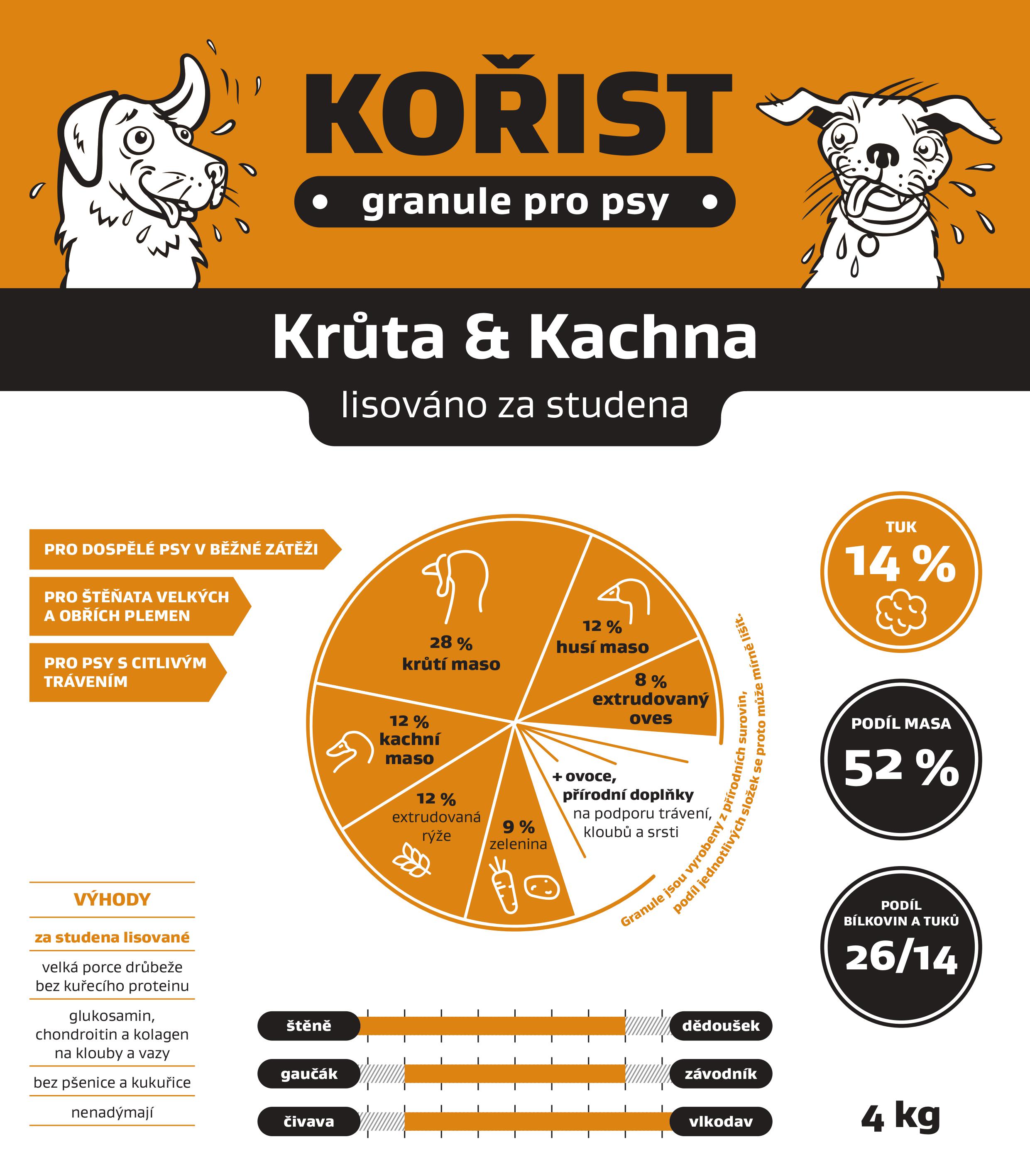 - Čerstvě zpracované krůtí maso – vysoce kvalitní složka – jde o nejhodnotnější drůbeží maso. Oproti kuřecímu obsahuje vysoké množství bílkovin (až 22 %), zatímco množství tuku je ještě nižší (kolem 3 %). Granule s krůtím masem se tak řadí mezi nejlépe stravitelné. Také má příznivý obsah minerálních látek.