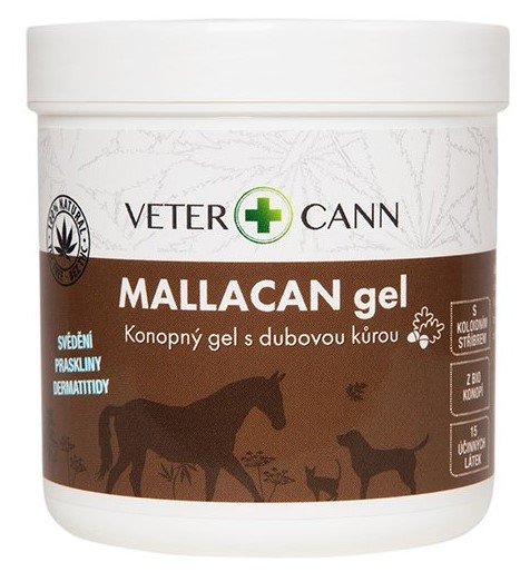 Vetercann Mallacan je konopný gel s dubovou kůrou a koloidním stříbrem. Je ideální k doléčení chronických podlomů u koní, ale i u ostatních zvířat k uzavření a doléčení drobných ran a oděrek, které jsou náchylné vlivem vlhka, nečistot nebo infekce zanesené hmyzem začít hnisat. Synergicky působí stahující dubová kůra a antibakteriální koloidní stříbro. Výhodou je, že gel na rozdíl od mastičky neuzavře ránu a umožňuje tak žádanou prostupnost plynům i kapalinám.